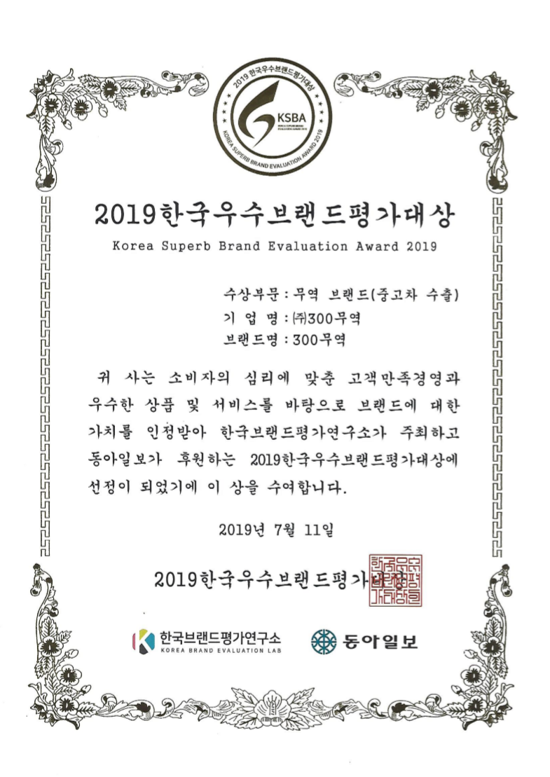 2019년에는 동아일보에서 주최하는 2019년 한국우수브랜드평가 대상 중고차수출 부문을 수상하였습니다.